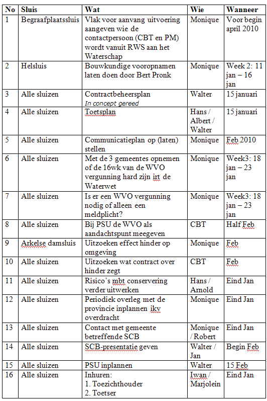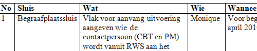 Door deze koppeling aan een actielijst kunnen de acties sneller en beter gemonitord worden. Door de actielijst actief via email of in overleggen te behandelen, weet iedereen in één oogopslag hoe het ervoor staat en wat er nog moet gebeuren. Daarnaast hoeft ook niet de hele risicolijst continu doorlopen te worden, waardoor er sneller gehandeld kan worden. De actielijst van het vorige voorbeeld (druk op het plaatje voor de volledige actielijst):