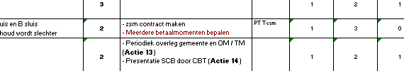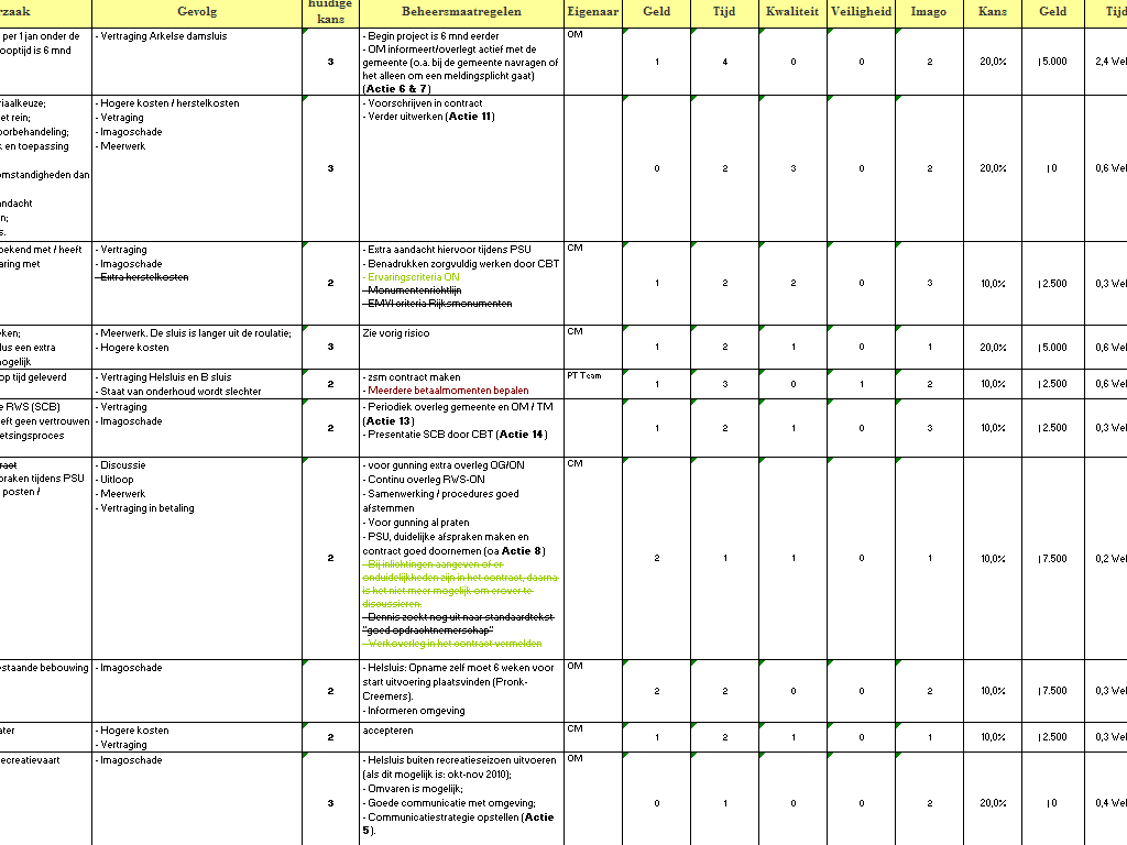 Beheersmaatregelen Een ander belangrijk onderdeel zijn de oplossingen voor risico's, oftewel de beheersmaatregelen. Deze dienen zo SMART mogelijk neergezet te worden. Een oplossing die hierbij helpt en in meerdere projecten is toegepast, is het koppelen van een actielijst aan de beheersmaatregelen. Een voorbeeld uit een lopend risicodossier (druk op het plaatje voor een groter voorbeeld):