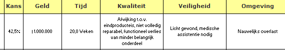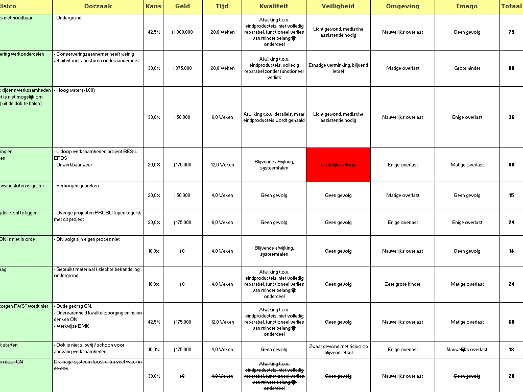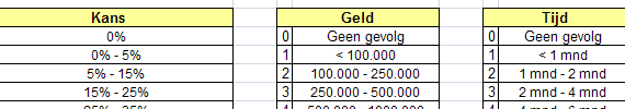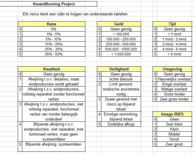 Kwantificering Als eerste belangrijke aspect van een risicolijst/dossier zal ik een voorbeeld geven van de kwantificering van een willekeurig project bij een overheidsorganisatie. Over het algemeen spelen geld en tijd de belangrijkste rol binnen een project en deze dienen dus ook gestuurd te worden. Binnen deze organisatie was dit inderdaad ook zo, maar veiligheid en omgeving speelden een evengrote zo niet grotere rol. Naast deze vier aspecten zijn de kwaliteit van de uitvoering en het imago van de organistie ook toegevoegd. Na een discussie met het projectteam kwam ik al snel tot de volgende kwantificering (druk op het plaatje voor een volledige kwantificering):